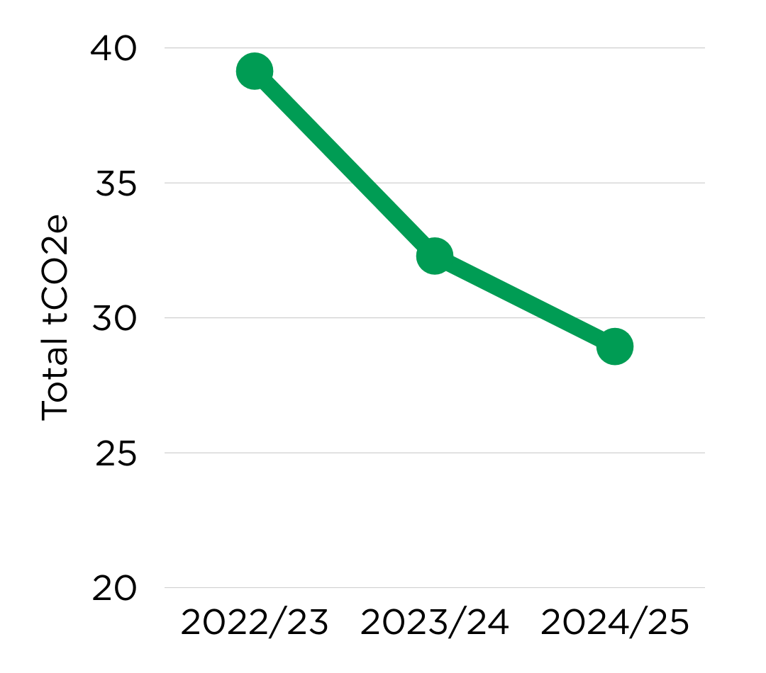 Chiltern’s carbon footprint reduced from 39.14 to 28.94 tCO2e between 2022/23 and 2024/25, a decrease of 26%. This change has mainly come about from a large reduction in staff petrol car emissions, no flights being used, and no longer having a permanent office.