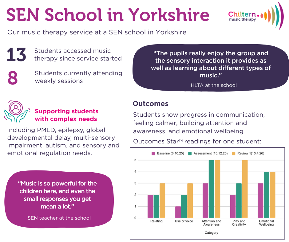 Progress is tracked using the Music Therapy Outcomes StarTM, with pupils showing improvements across key areas including communication, attention, creativity and emotional wellbeing.