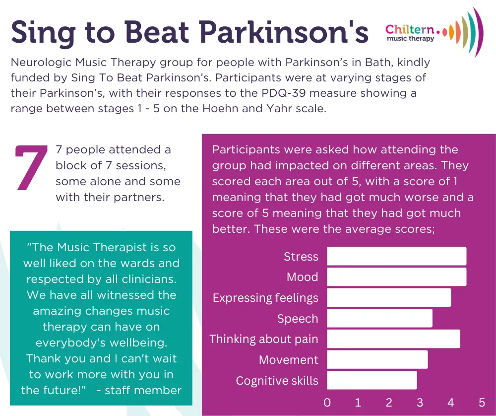 Laura previously led a similar group during her Music Therapy training placement at the Clara Cross Parkinson's Clinic in Bath. After completing her qualification and joining Chiltern, the group reconvened in the community and later transitioned to an online format during the COVID-19 lockdown.
