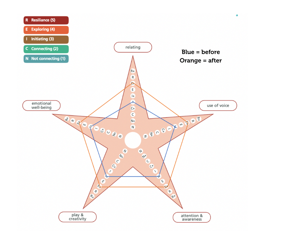 In order to monitor progress within the sessions the Music Therapy Star was completed by the Music Therapist for each student. The star data were completed at the start of their therapy, during therapy (for those receiving longer term support) and again in April 2025.