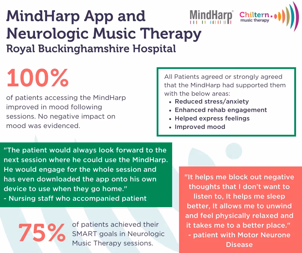 In 2021, Neurologic Music Therapist James Lea provided a half day a week of therapy sessions utilising the app MindHarp at the Royal Buckinghamshire Hospital in Aylesbury.