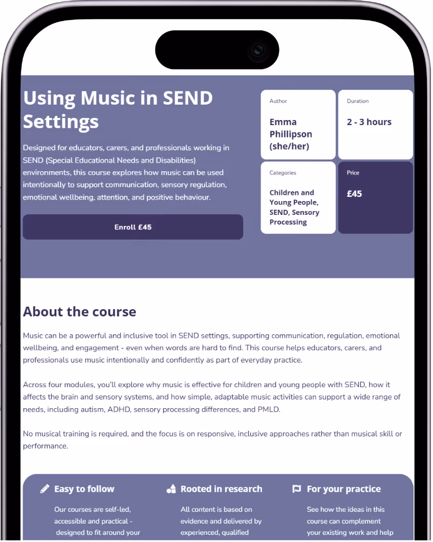 This thinking sits at the heart of our new course, Using Music in SEND Settings, now available on our Learning Space. The course shares simple, practical approaches to using music intentionally to support communication, attention, regulation and wellbeing in SEND environments - especially for those who don’t see themselves as “musical”.